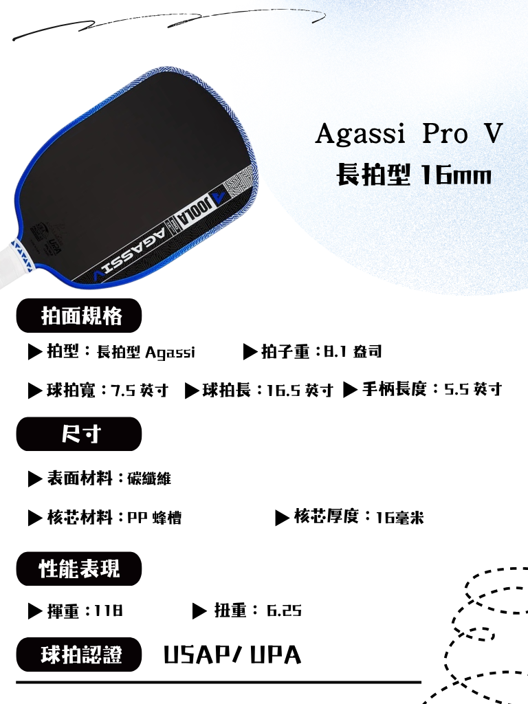 The Agassi Pro V is made for players looking for reliable performance across the entire court, delivering confidence on aggressive drive, and precise touch for well-timed dinks that catch opponents off guard.