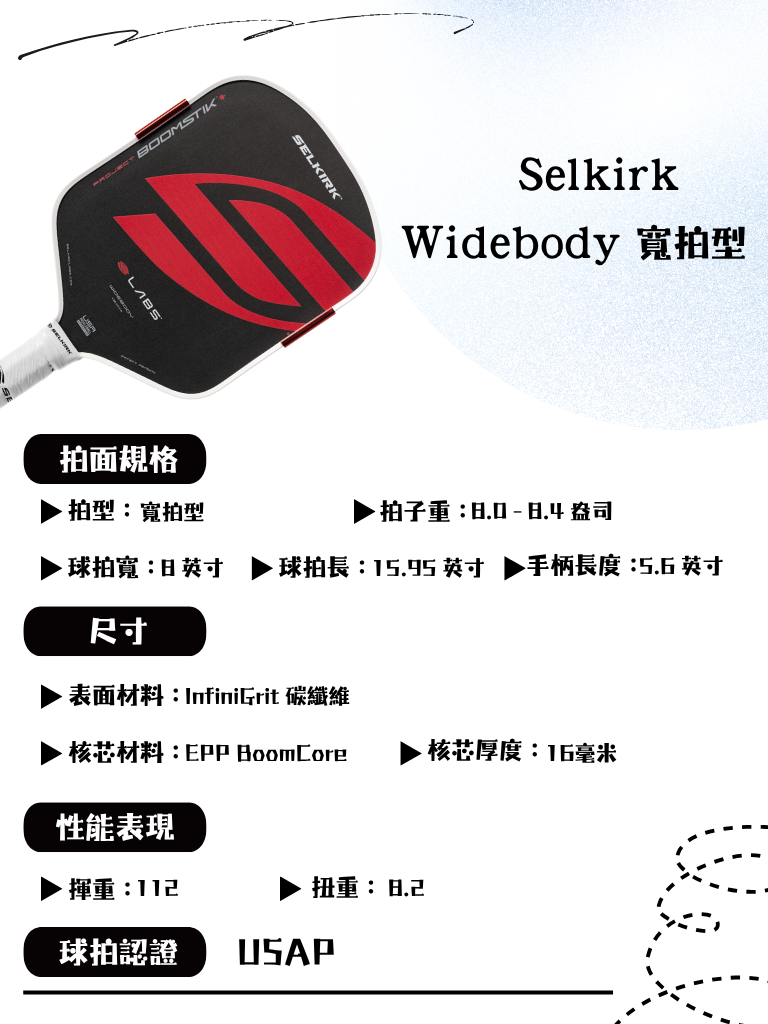 Widebody | Longer Handle & Wide Paddle Shape The widebody shape features a longer handle for added reach and extra space for two-handed backhands. This shape enhances stability and delivers a more consistent, forgiving sweet spot — especially on off-center hits. Ideal for players seeking the largest sweet spot and a consistent feel and performance across the face.